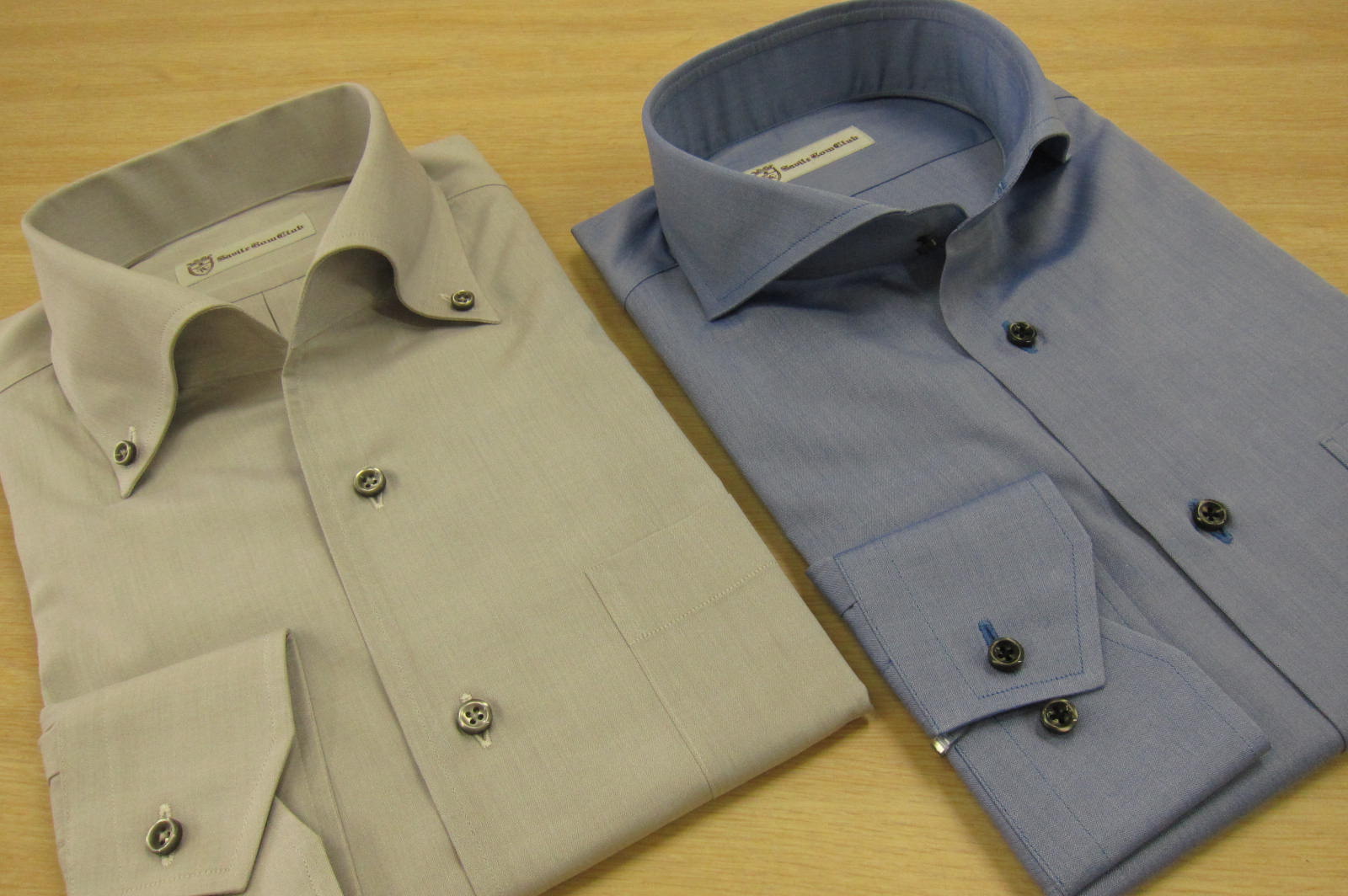 静岡市Mさん。右、伊カンクリーニのブルー刷毛目ホリゾンタルカッタウェイ。左もカンクリーニのライトグレー無地ですが、衿型がちょっと変わっていて、スキッパースタイルでワンピースのボタンダウン。だから、衿と台衿がひとつのパーツ(=ワンピース)でしかも台衿ボタンがありません(=スキッパー)。