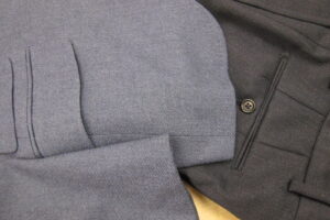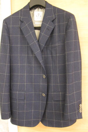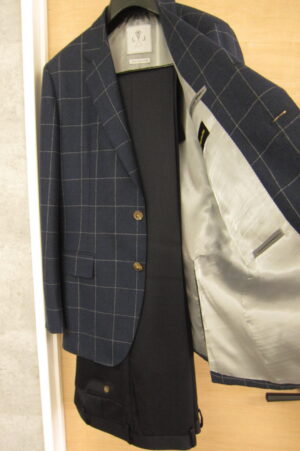 藤枝市Kさん。廃番のため値下げになった英W.Billのフェニックスを使って明るめ紺で2インチ格子のジャケットをご注文。併せて濃紺無地のトラウザーズは、伊カノニコのライトウェイトのキャバーリーツイル(コバート)を使いました。乗馬パンツのようなコットンタッチのウール100%です。