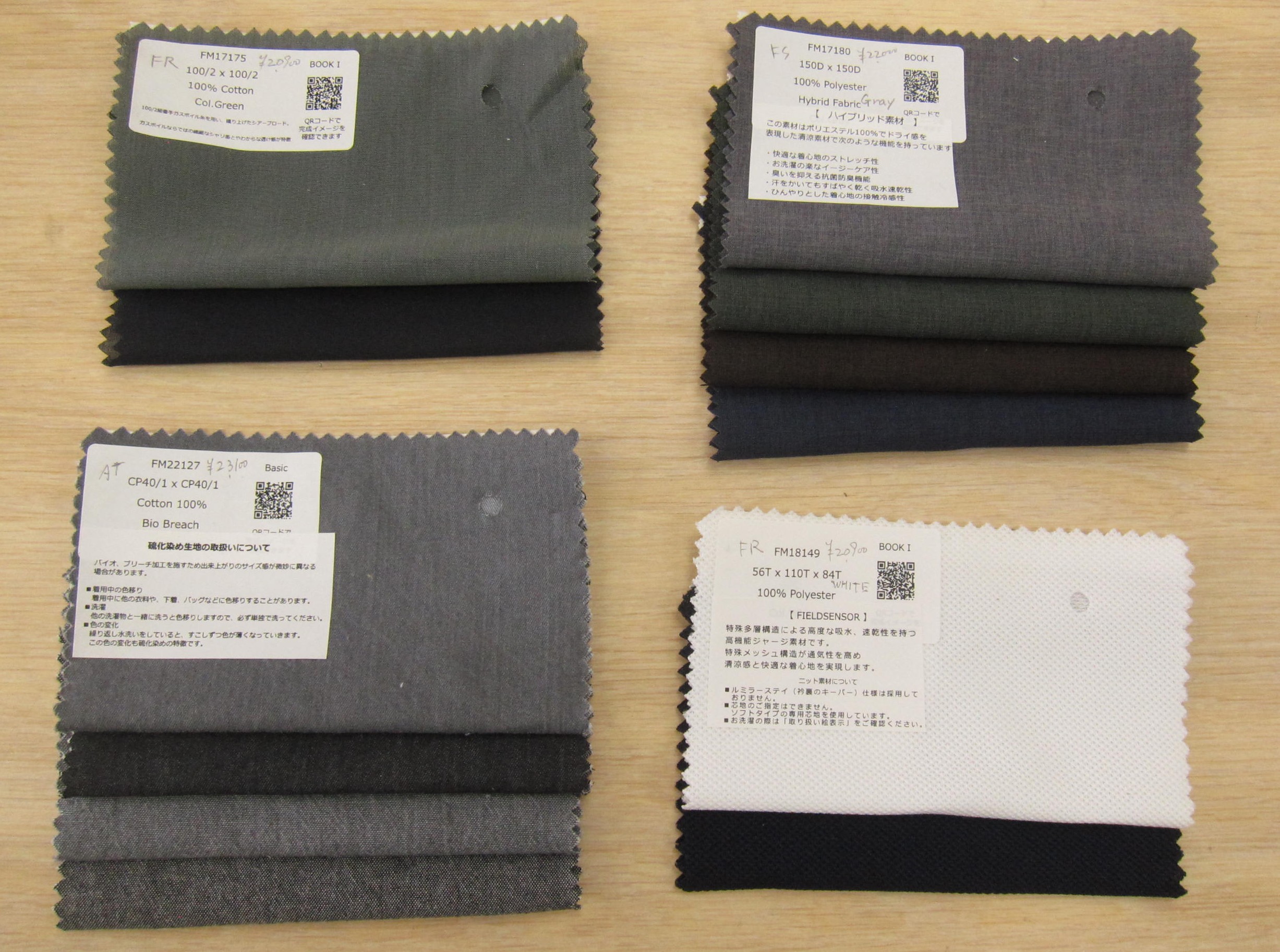 織り方の違いで、左上の2つがホップサック450gm/15oz。次の*98533のみ3ply480gm/16oz.