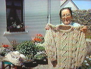 ★イニシマンに着いたルーリィは、モーリン・ニ・ドゥンネルを訪ねます。モーリンは、20歳代の頃からイニシマンでのアランセーターのまとめ役で、パドレイグはモーリンを娘のように可愛がっていましたし、両親を早くに亡くした彼女もまた、彼を父親のように慕っていたといいます。アランセーターを編む若き日のモーリンの表情を映し出す映像に、そんな仲の良さが感じられます。 モーリンは、また島一番のニッターでもあり、ローマ法王ヨハネ・パウロⅡ世にセーターを献上した当時の話も出ます。さらに、伝統技術を継承することの重要性も、母と娘の会話からひしひしと伝わります。 |