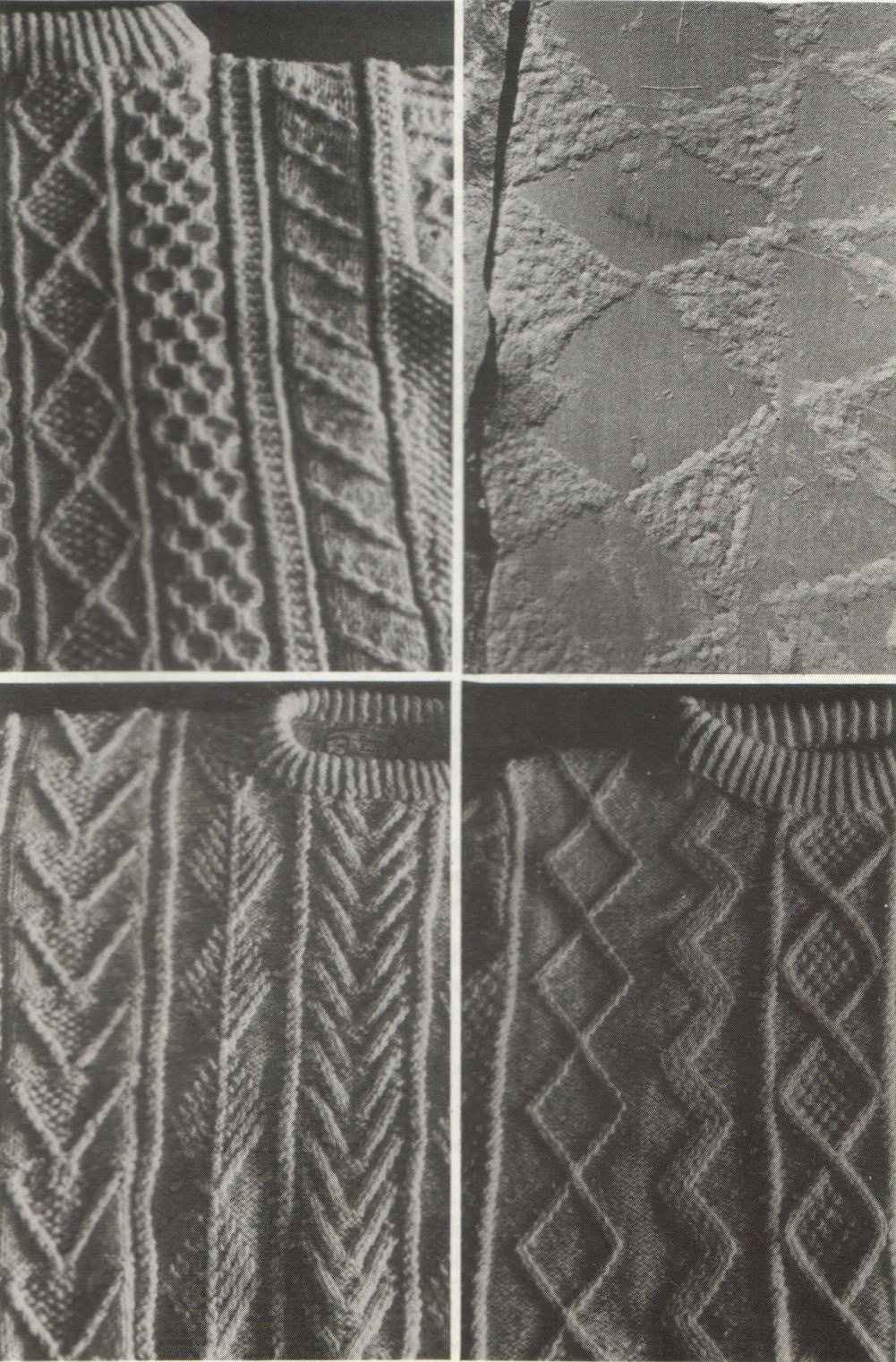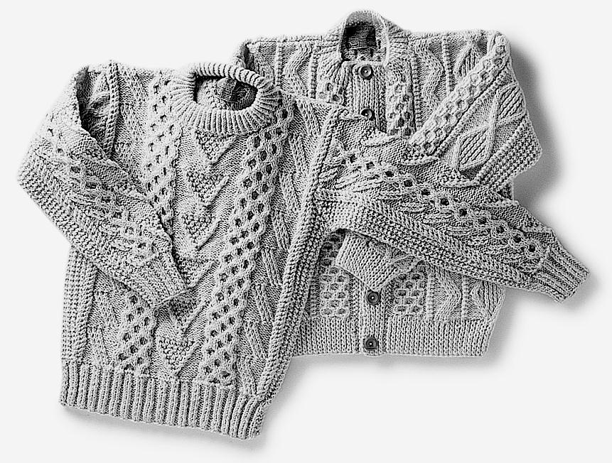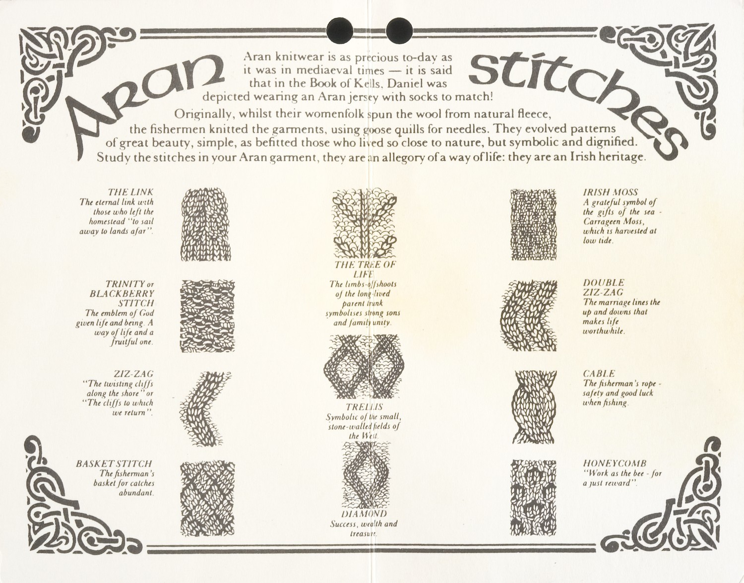 「六世紀の昔からアラン諸島で編み続けられているアランセーター。白いウールで編まれたその独特の編み柄には、漁に出る夫の無事と豊漁を願う女たちの祈りの意味が込められている。その組み合わせは、家々の編み手によってあたかも家紋のごとく異なり、それは母から娘へと伝承されている。万一、不幸にも漁での溺死者が岸に打ち上げられたときには、着ているセーターの柄でその身元を判断したといわれる」