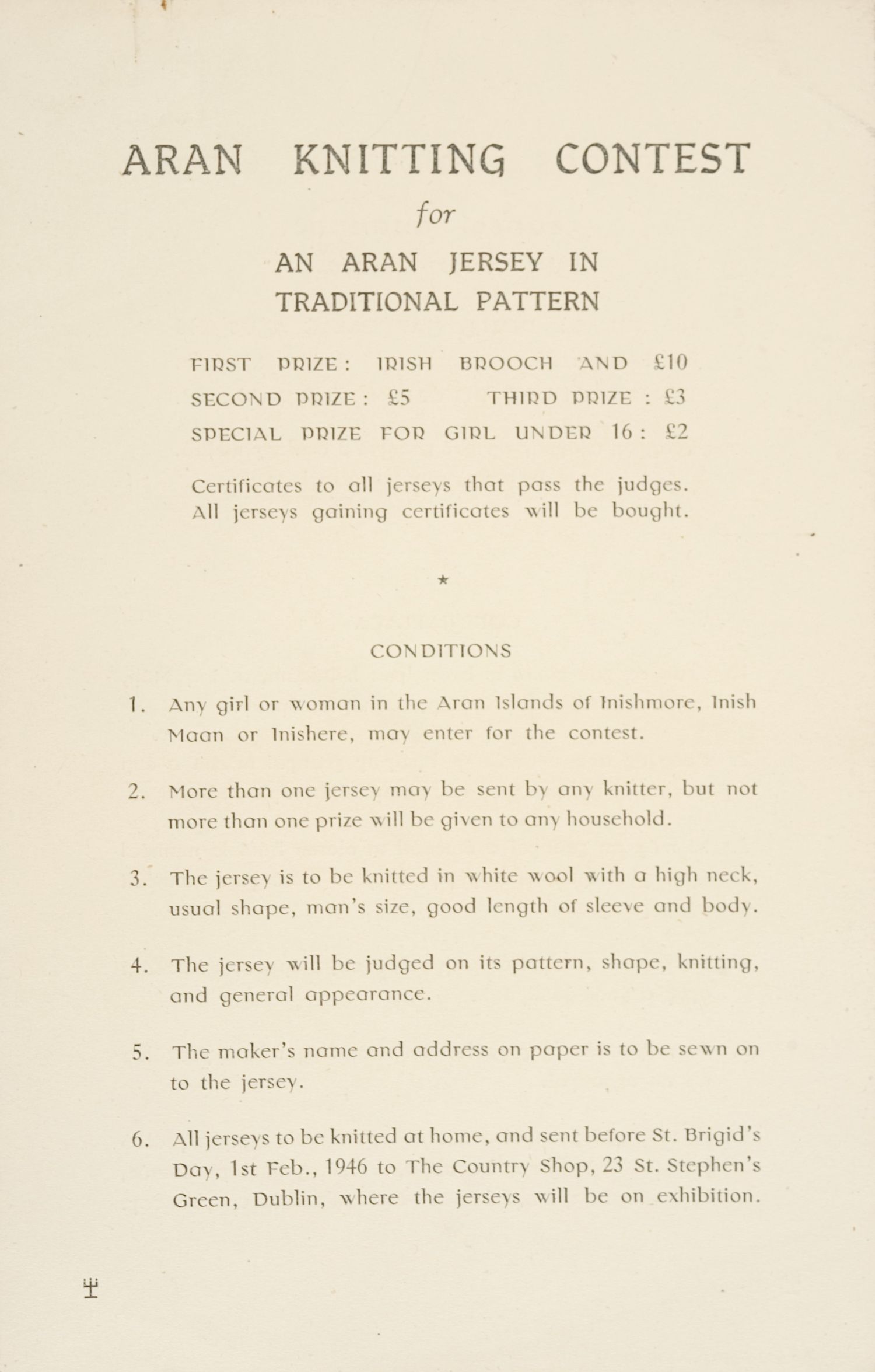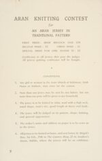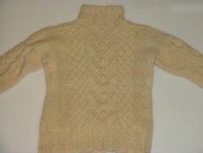 終戦直後の1946年、ゲインの声掛かりで「アランセーター・コンペティション(競技会)」が開催されます。アランの3つの島に呼び掛けられエントリーは50枚を超えました。賞金の掛かったコンテストですから、編み手たちは持てるスキルを惜しみなく注ぎ込み、それはそれは素晴らしいセーターが集まりました。第一位は当然ながらマーガレット・ディレイン。その時の優秀作の11枚は国立博物館カントリーライフ館に保管され、2008年にはこれらを一同に展示する初のアランセーター展覧会が開催されました。商業化していく以前の、アランセーターが最も技巧に優れていた時代の勢いが感じられます。2022年になって、ダブリンのクレオでは、これらの博物館保存のセーターのレプリカ制作の許しをえて、そこから私のところにも年に一枚ずつぐらい入手できるようになりました。