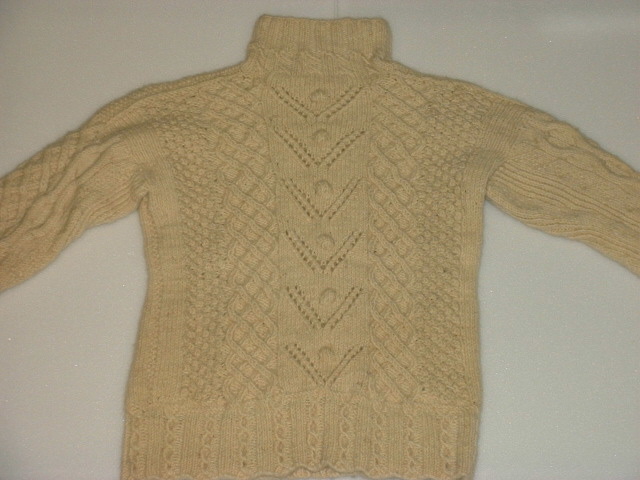 2001年に私はモーリンに特別な頼みをしました。あなたの持ちうるステッチ(柄)のすべてを前後左右を使って編み入れた、私だけの一枚を編んでもらえないだろうか。3ヶ月の後届いたのは前身頃と後ろ身頃で柄違い、それも左右非対称、右袖と左袖も柄違い、実に30種類の柄を使い、ひとつとして同じ柄がない、という21世紀の最高傑作、世界でたった一枚のアランセーターです。