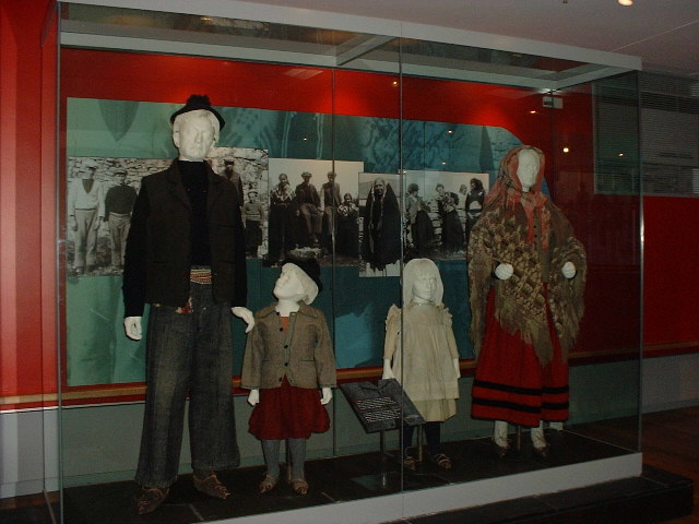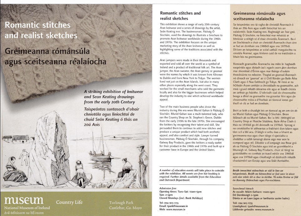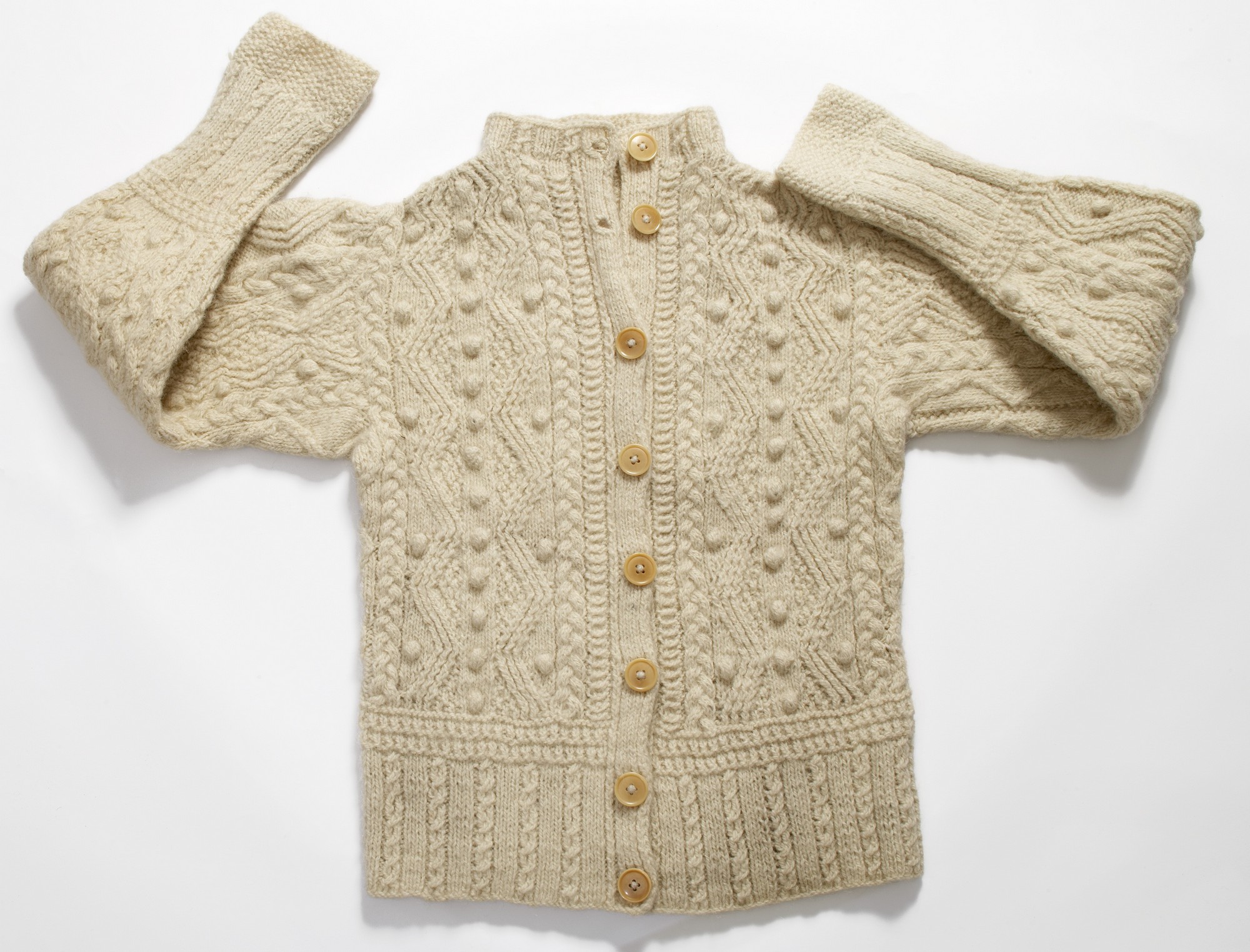 1920年代後半に、アイルランド文部省は民族研究委員会を組織し、その調査団がイニシモアで3枚のアランセーターを収集しています。大人の男性の紺色のプルオーバー、女性用の茜色のカーディガン、そして子供用の白いセーター。この3枚のセーターは2001年に開館したアイルランド国立博物館カントリーライフ別館の入口付近に、さながら映画「アラン」の一シーンを切り取ったかのように、マネキン人形に着せられ大きなガラスケースに堂々と飾られています。