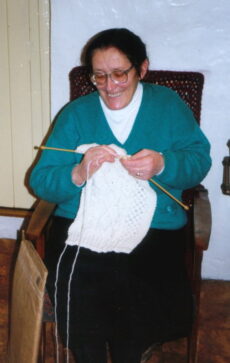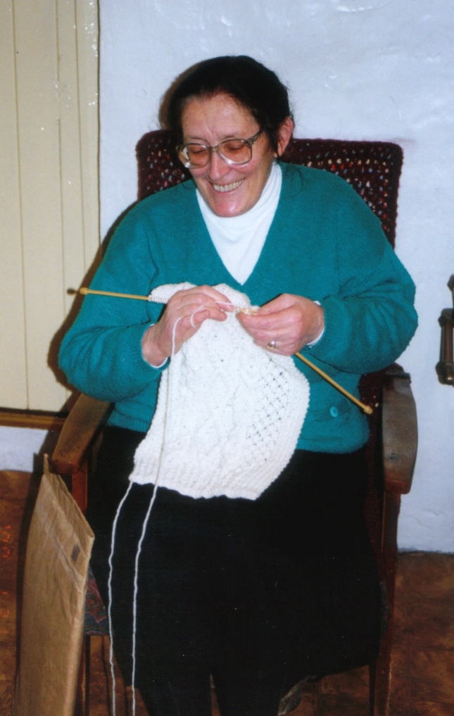 モーリンに初めて会ったのが1993年、以来4回島を訪れて会いました。長くパドレイグ・オシォコンの命を受けてイニシマン島のまとめ役を勤めていた島一番のニッター、モーリン・ニ・ドゥンネル。かつてローマ法王への献上セーターをも編んだ伝説のニッターも80歳近くになり、仕事として編むことはやめていましたが、それでも時間さえあれば編み棒を動かして小さなものを編む毎日でした。その手先の動きは昔とまったく変わらず目にも留まらぬスピード。ゆっくりと笑顔で話をしているのに、指先だけが別の生き物のように勝手に動いているという印象です。「何も急いで編んでいるわけではないのです。長いこと編んでいますが、このスピードが私の心を一番穏やかにするのです」。モーリンは昔とまったく変わらぬ言葉を私に与えてくれました。「このセーターは私が編んでいるのではありません。神が私に編ませてくれた、神様からの贈り物なのです」。