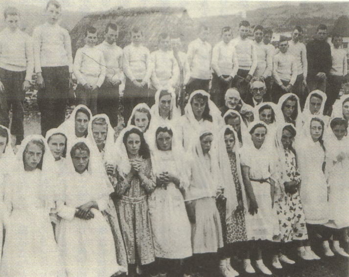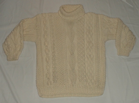 アラン諸島には「男の子は悪魔にさらわれる」という古い言い伝えがあり、男児も女児と同じワンピースのような赤い服が着せられました。そして12歳になってようやく男の格好ができる、その時の儀式が教会の堅信礼(コンファメーション)で、いわば日本の元服式に当たるようなものだったのでしょう。ちょうど島の女たちが編み物に夢中になっていたこのころのこと、この堅信礼にあたり、母親はわが息子のために精一杯豪華な白いセーターを編んでやったのでした。