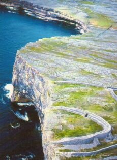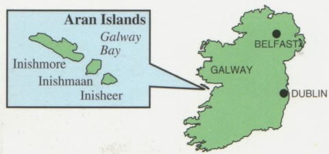 アランセーターが生まれたのは、そのアイルランド西岸ゴルウェイ湾の沖合に浮かぶ三つの小さな島々で、総称してアラン諸島と呼びます。西から、イニシモア、イニシマン、イニシイア。イニシはゲール語(ケルト語)で島を意味し、イニシモアは「大きい島」、イニシマンは「真ん中の島」、イニシイアは「東の島」といういたってシンプルな名付けがされています。
