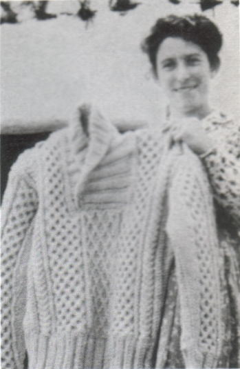 子供用の白いセーターを大人サイズに編む、このまさにコロンブスの卵的なアイデアを与えたのがミュレイル・ゲインという女性です。彼女はアイルランドの各地に伝わる女性のクラフトワークを支援し続けた女性活動家で、それらのクラフトワークの数々はダブリンで彼女が1930年に開店したカントリーショップに集められて販売されました。1931年イニシモアを訪れた彼女は島の女たちにこう頼みます。子供用の白いセーターを大人のサイズで編んでもらえないかしら。そしてそのセーターはカントリーショップの店頭に並ぶことになります。 ゲイン女史こそアランセーターの持つ芸術的価値を初めて認識した人物で、アランセーター普及の最初の立役者と言えます。