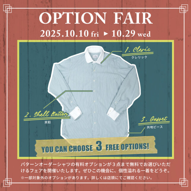 シャツを作ろう!!~オプションフェア。10/10(金)から10/29(水)まで。有料オプション3つが無料に。 2025年10月1日 10/10(金)より10/29(水)まで。有料OP3つが無料、のおなじみキャンペーン。ボタンやポケット、ネーム刺繍などディテールに凝ってみたり、ビッグサイズ(首廻り45cm以上や裄丈90cm以上)の方には嬉しい恒例イベントです。これに併せて、シャツ生地の新作、綿ネルチェックやカリビアン、トーマス・メイソンなどの新柄、も、10/10頃に配信されます。多少のフライング注文を受け付けます。ぜひご予定ください。 Tweet