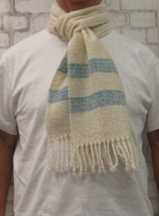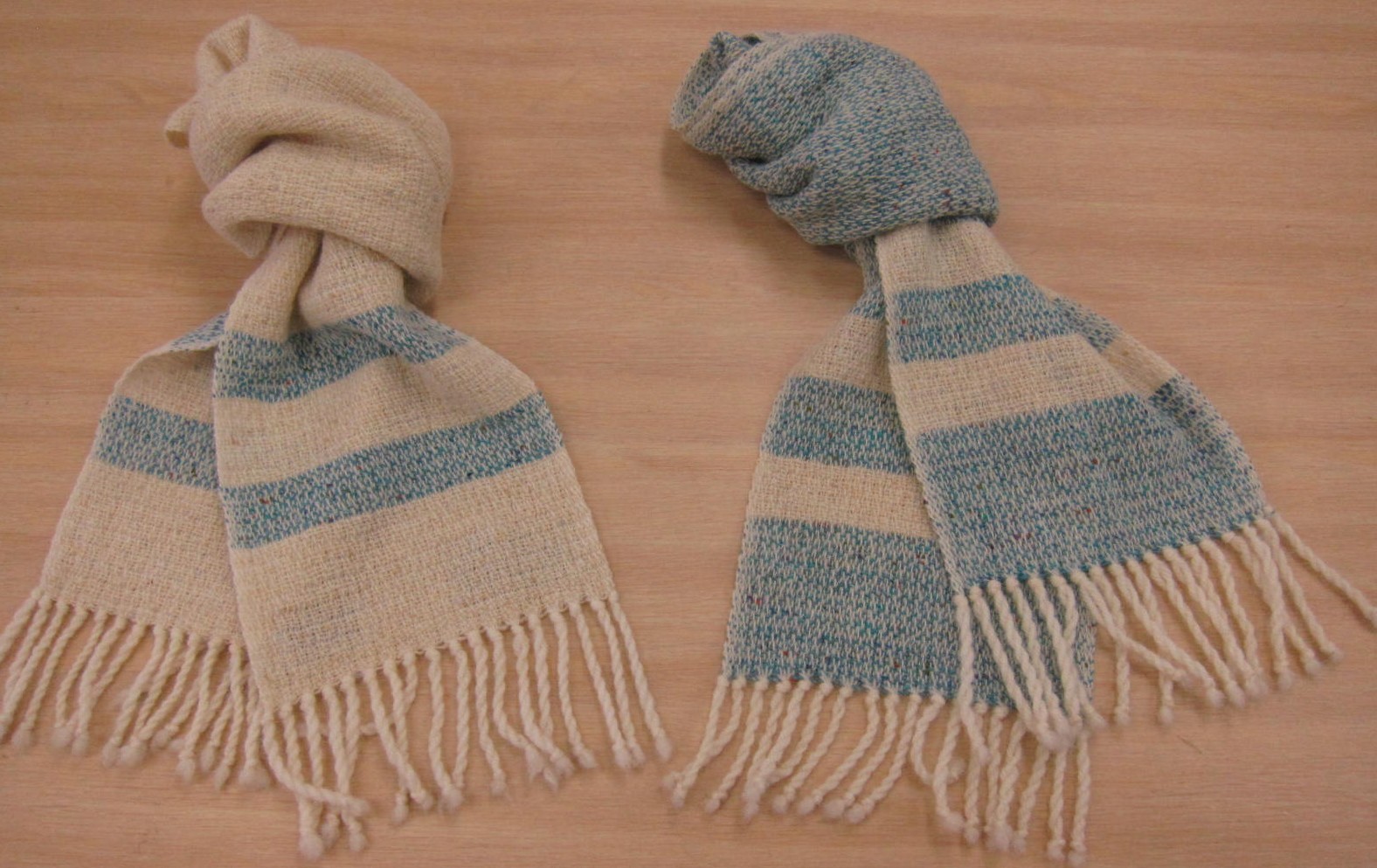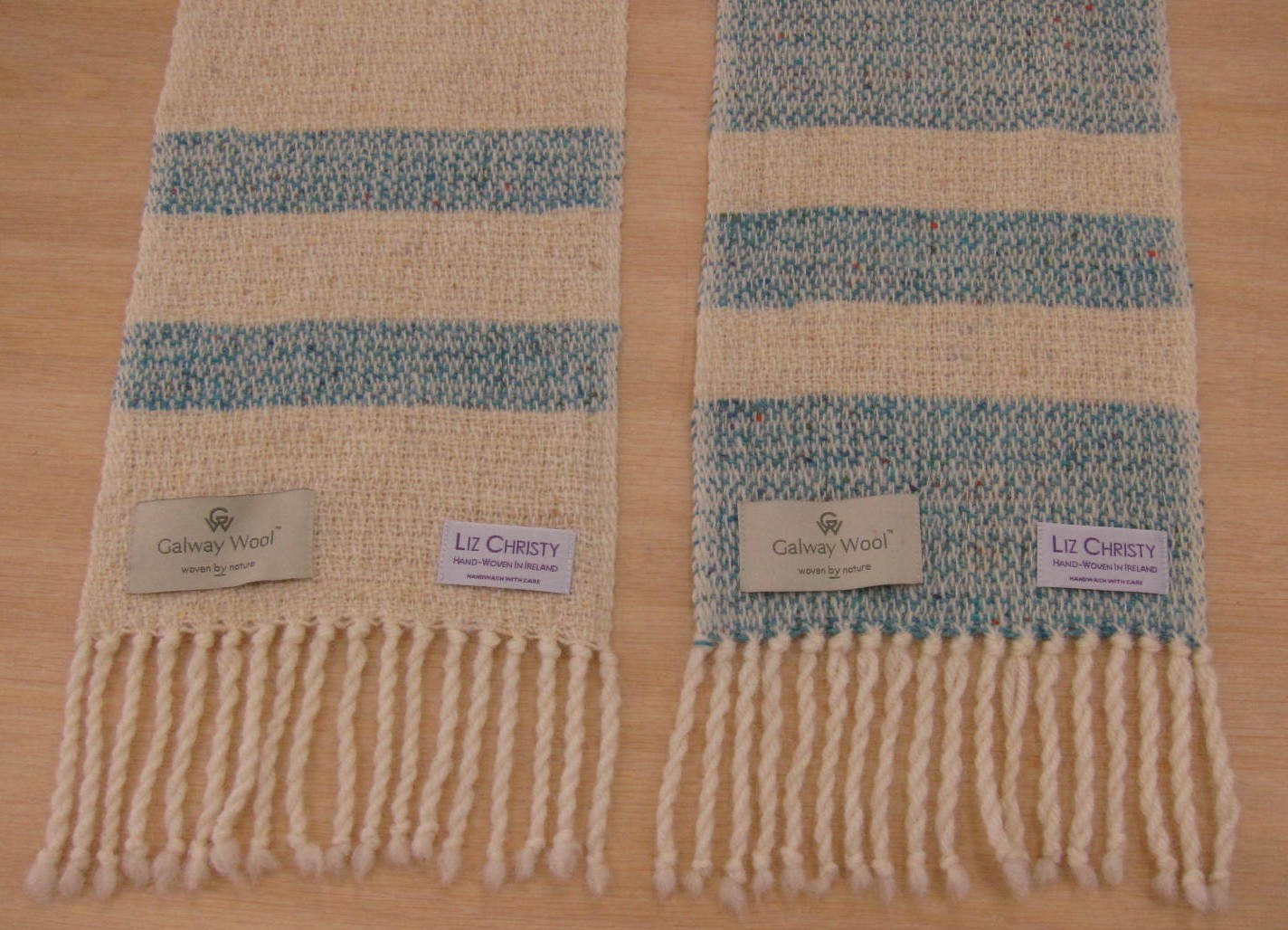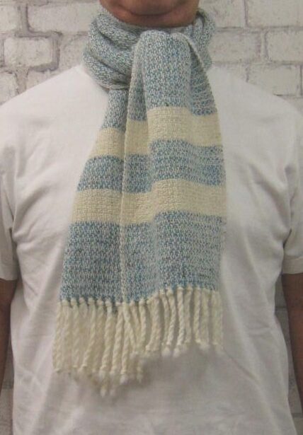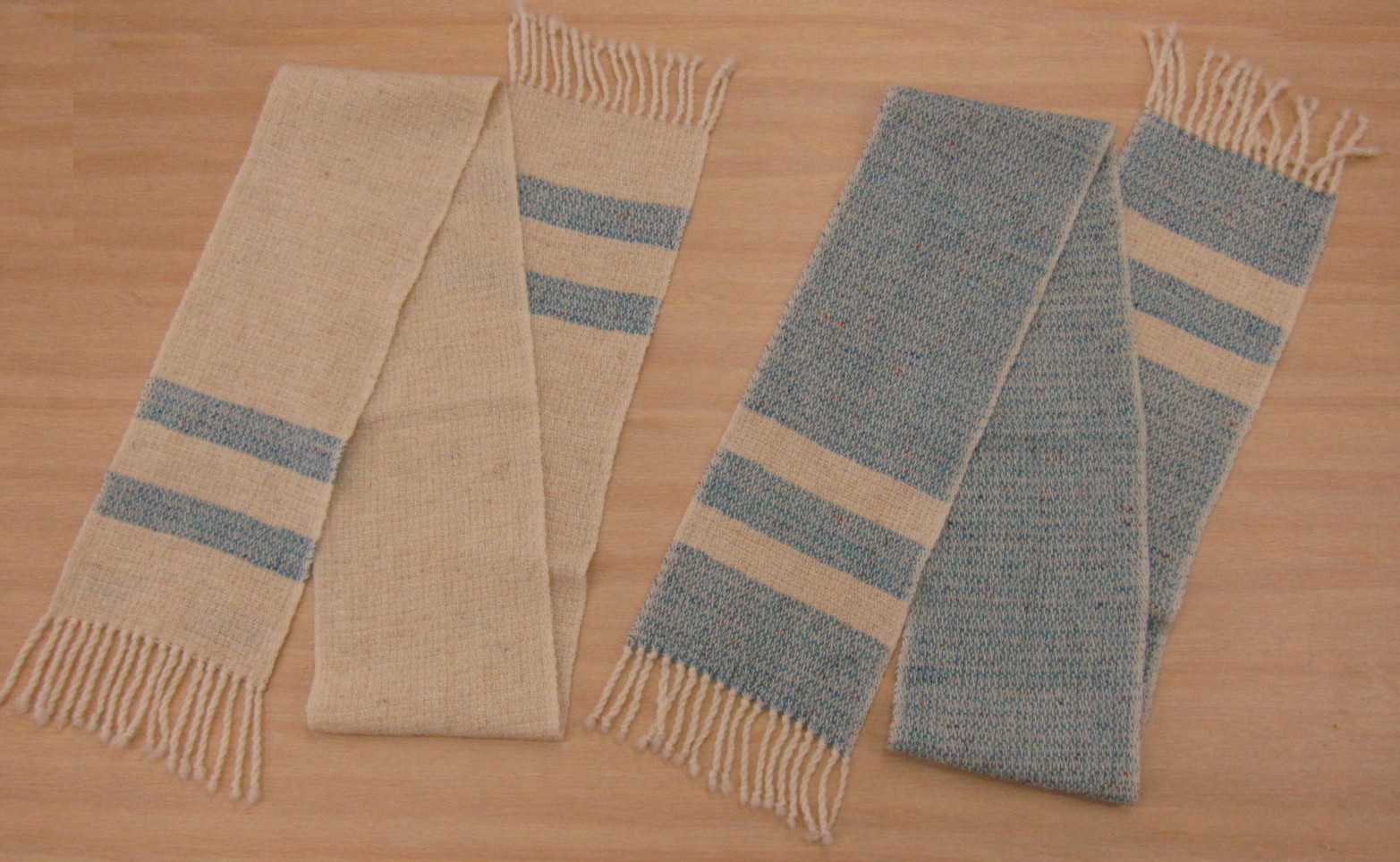 warp(タテ糸)はGalwayWool Bainin100%、welt(ヨコ糸)はネップ入りのメリノウールで、白とブルーの2色を使いストライプを入れました。ということで、白主体とブルー主体の2柄の展開です。