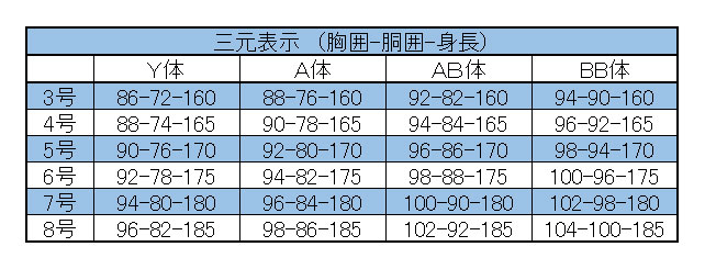 A5とかYA7とかAB4とか、聞いたこと、ありますよね。Y.A.B.E.というのは、字をよく見てください、はい、痩せ型から標準体、肥満体まで、を字面で表します。で身長165cmを4,170cmを5、と、5cm刻みで便宜上数字を振ります。胸囲―胴囲―身長、これを三元表示といいまして、こんな表ができます。