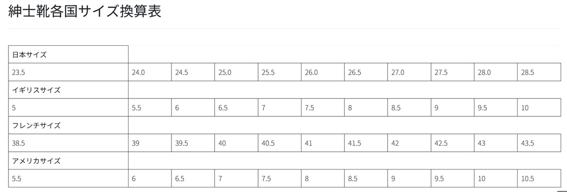 靴のサイズ、これがまた、大変で、いくら調べてもその根拠がわからないのです。英国式はやはりインチだろという人がいるんですが、じゃ、7.5という靴のどこを測ったら7.5インチつまり19cmなのか、誰も答えてくれないんです。英国とアメリカで半サイズずれる理由もわかりません。それに靴は長さだけでなく幅も重要な要素なんですが、これも統一した基準がないみたいです。ですので、もう単純に暗記するしかないんです。下の表で自分のサイズを覚えてください。あくまでも目安ですよ。誰かこれらの数字の根拠をご存じの方がいたら教えて欲しいです。
