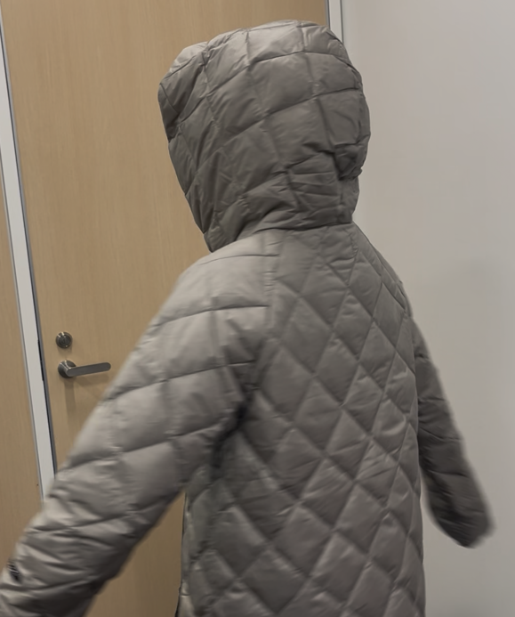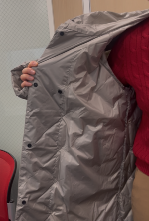 ダイヤモンドキルトでAラインのシルエット、ファスナーがなくて、いくつかのスナップボタンで留める、というシンプルな構造です。