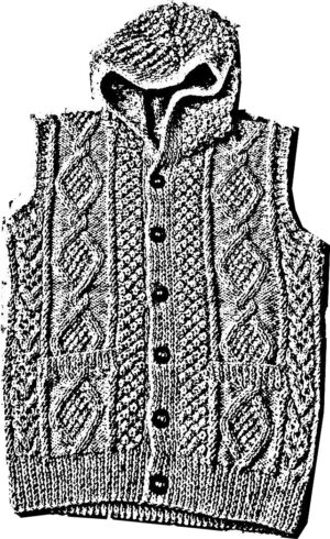 これも実はかつて仕掛けたもののリバイバルです。前開きベストにフードを付けてカジュアルにしました。こちらも編み柄はサンプル画像とは変えます。予定価格79,200円。
