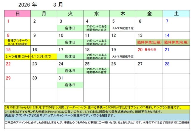 いい生地を3,000円off または オプション3つ無料。どちらかを選んでください。併用はできませんよ。当店店休日の関係で、3/15(日)から4/13(月)まで、週末5回のロングランです。