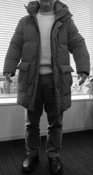 着用者・野沢のプロフィールは、年齢64歳、身長164cm、体重74kg,胸囲96cm,ウェスト88cm,なで肩で腕は短くシャツ裄丈で78cmです。