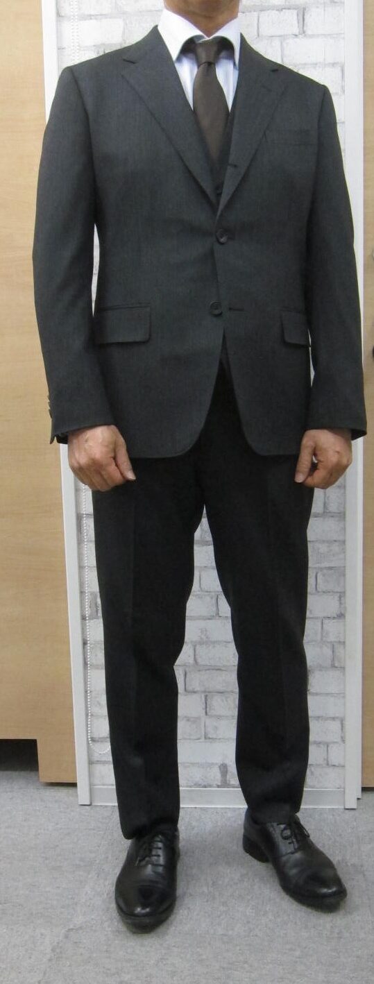 葛利毛織のクラシックなマイクロヘリンボーンでチャコールグレー。細く仕上げた袖がうまくカーブして腕に吸い付くようにフィットしています。Yさん、おめでとうございます。