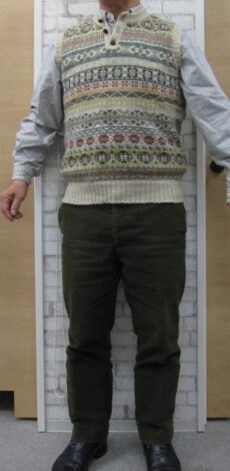 アイリッシュの長身モデルさんが着ると膝の見える丈ですが、156cmの日本人が着るとちょうど膝の位置の丈になります。