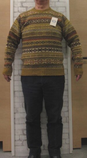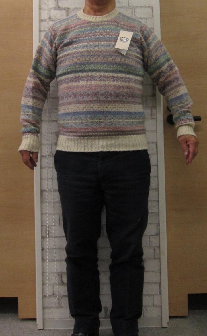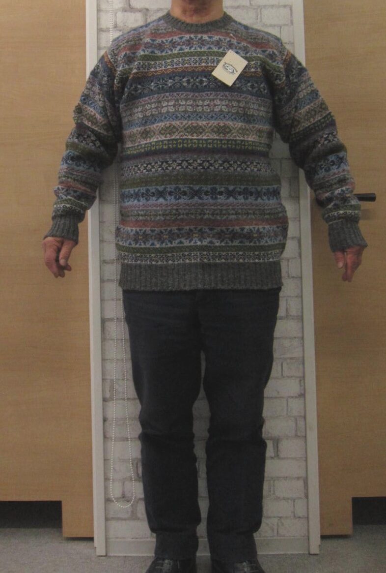 やむなくモデルになっています、私・野沢のプロフィールは、年齢67歳、身長164cm、体重72kg,胸囲98cm、ウエスト87cm、首が長くなで肩で胴長、腕は短くシャツの裄丈で78cmです。