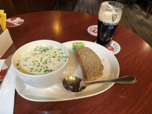 大好きなJack・B・Yeatsのコレクションもじっくり鑑賞。グラフトン界隈の古いパブでチャウダーとギネスでランチ。うまい。ダブリンに帰ってきたぞ、つて実感。マークス&スペンサーでパンツも買って(倶樂部余話【444】参照)ダブリン市内観光はこれでおしまい。また市バスでホテルに入り、荷を解く。夜のレセプションパーティのため、着替えないと。今回展示会を後援するアイルランドの政府機関から若干のサポートをもらっているので、こういう催しには顔を出さないと義理が立たない。食事代を浮かせるのはありがたいが、このパーティのために一日早く出て11時間も待機して、と考えるとどうなんだろ、とも思う。パーティの後パブでギネスを1パイント引っ掛けて、就寝。