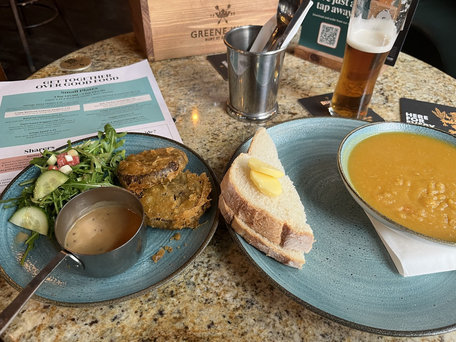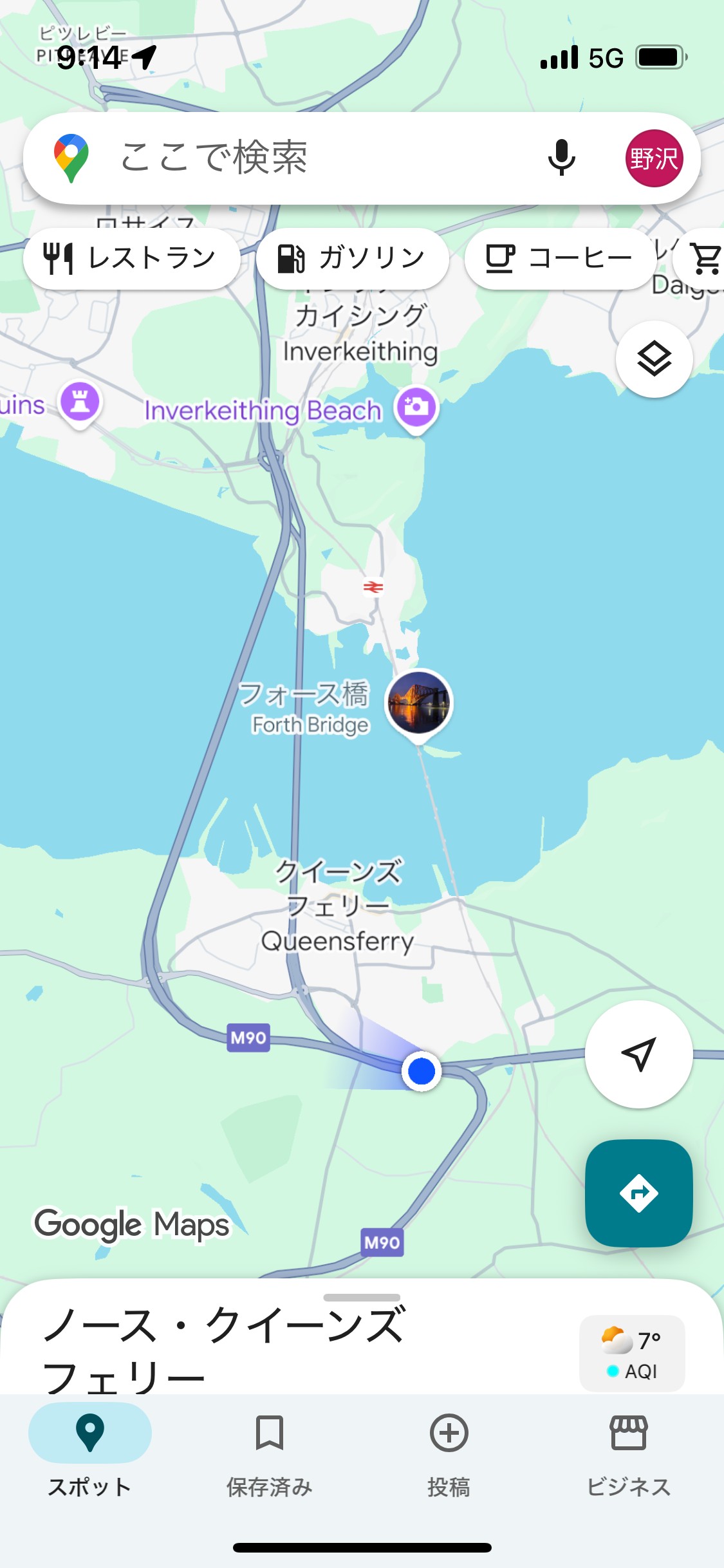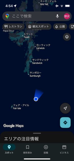 ダンディーの街でぶら散歩。観光の目玉は2018年に出来たV&A美術館(ロンドン)初の別館でこれが隈研吾の設計。世界初の南極観測船ディスカバリー号(乗船できる)と並んで海に向かった光景、背後には美しく湾曲するテイ橋、お見事。ダンディーで食べたかった2つのもの。ひとつはハギス。バーンズナイト(スコットランドの詩人バーンズをたたえて誕生日の1/25に伝統料理ハギスを食して祝う習慣)が近いのでここで食べておきたかった。古いパブで頼むと、ハギスをスライスしてフリッターにしてあり、スコッチウィスキーソースが添えられている。ブラックプディングに近いかな。満足。もう一つはこの街の名物お菓子ダンディーケーキ。特産のマーマレードを使い白ブドウ(sultana)を入れたフルーツケーキでアーモンドがトッピングしてある。老舗の菓子舗で入手。家族への土産に。ダンディーからアバディーンまでは鉄道。北海の海べりを北上する。右手には北海の波しぶきがかかってきそうなビーチ。左手は荒涼としたスコットランドの草原。えっ、旗が立ってるぞ、ここゴルフコースだ。そうだ、ゴルフ発祥の地セント・アンドリュースはダンディーのすぐ南だし、まさに本場のリンクスの海の間際を線路が走ってる。ゴルフは羊飼いの暇つぶし、バンカーは羊の風よけ場、というのがよく分かる。そして列車はスコットランド第3の都市アバディーンAberdeenに到着。午後4時なのにもう真っ暗。駅ビル内のタイ料理屋でパッタイをテイクアウトしてから、フェリーのターミナルまで歩く。どうせまた戻ってくるんだからどこかで重たい荷物を預けたかったが場所がわからずそのまま乗船。これが吉と出るのは後述。さあ、12時間の夜行フェリーの旅。事前に2つのメールが入ってる。ひとつはナオコさんから「すごいオーロラが見られるみたいですよ」。キャビンクルーに聞いたら「おお、昨日の夜はすごかったよ。ほら写真見て。夜9時ぐらいかな。あの奥のドアから外に出られるからお楽しみにね」。もう一つはジェイミーソンズのピーターから。「今夜の海は荒れるからあらかじめ酔い止め買って飲んでおくように。船内には売ってないよ。朝8時に迎えに行く」どっちが正しいんだろう。