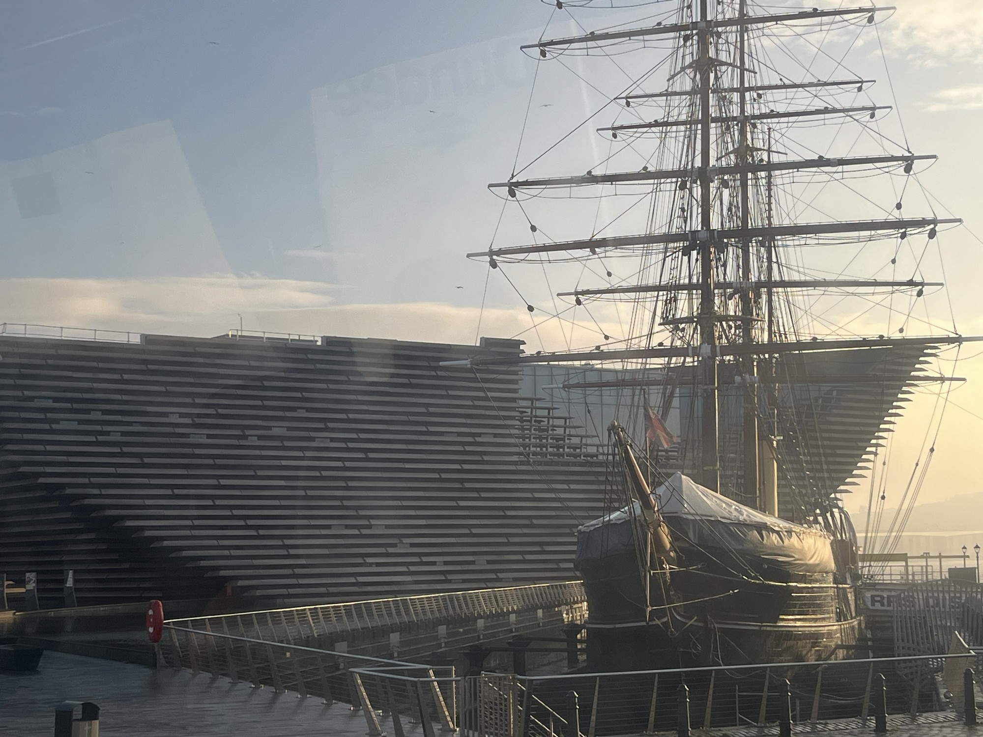 ※第5日目1/20(火)。この日は移動の一日。持参の朝食(豚汁、おかゆ、ミックスフルーツ、魚肉ソーセージ、6Pチーズ)を部屋で摂り、エジンバラ空港からダンディーDundee行きの高速バスに乗る。右手にフォース鉄道橋Forth bridgeを臨む。鋼の恐竜とも言われる世界遺産。圧巻だった。その後も湾曲が美しいテイ鉄道橋Tay Bridgeも見られて、バスの中で一人はしゃいでいた。