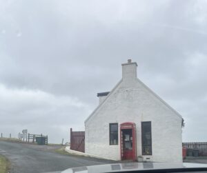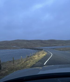 ※第6日目1/21(水)。揺れる揺れる、オーロラどころじゃない。ピーターが正解。唸りを上げて進んでいたが、途中で急に減速モードに。もう着いたのか、まだ2時間あるのに、と、携帯を見ると、うわ、まさにフェア島を過ぎたところじゃないか。そうか、きっと南風なんだろう、波に乗って早く進んだんだ、ここからゆっくり時間調整だな。ふらふらの体で定刻に下船。体がずっと揺れたままだ。一日中揺れたままだった。ここはシェトランド島Shetland Isle.の首都ラーウィックLerwick。ピーターの車でジェイミーソンズのファクトリーがあるサンドネスSandnessまで小一時間のドライプ。夜が明けてくると、シェトランドの荒涼とした風景が見えてくる。氷河に削られた痩せた土地、voeと呼ばれる谷間に海が奥まで入り込んで陸地を狭めていく。あ、羊が海藻を喰んでる、ホントにそうなんだ。サンドネスはジェイミーソンファミリー発祥の地。祖業は八百屋だったんだって。電話ポックスのある小さな建物が今も残っていて、そこで物々交換でウールが溜まったんで今の商売に進んだんだと。ファクトリーは八割が毛糸屋さん、セーターやさんは二割だけ、という感じ。原毛から製品までをそれなりの規模で一貫して自社内で完了できるファクトリーはシェトランド島はもちろんだが、英国内でもなかなかないだろう。これもまた別の機会に詳しく述べることにしよう。