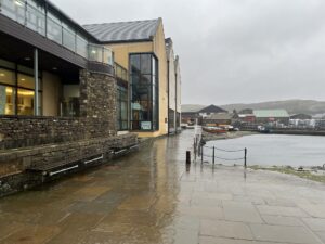 そうこうするうちに、今夜のフェリーが荒天のため欠航になったとの知らせ。あれ、帰れないよ。まあ一日ぐらい遅れてもいいか、とも思ったが、ピーターが言うには「この欠航は三日は続く。今夜のフライトで戻れ。今予約取るから。空港から一番近くて安いホテルも取っとく」と迅速。きっと慣れっこなんだろう、こういう事態。助かった、帰れる。でも8万円が一瞬で飛んだ。また小一時間掛けてラーウィックへ戻る。いよいよアンダーソンとエベレストの商談。これは前話で書いたので省略。倶樂部余話【448】参照。残るは博物館で資料収集だ。この博物館Shetland Museum & Archives は想像以上の施設で、街のコミュニティセンターとしての役割を担っているように感じた。結婚式までやってる。この島の一番大きな産業は最近では北海油田関連なのだが、ウール産業がこの島の維持発展に欠かせないものだという認識と愛情、それがひしひしと感じられて感動した。わずか9時間の島での滞在だったが、来てよかった、また来なくちゃ、と、思わせるとても意義のある滞在だった。ほんとは美味と言われるシェトランド・シープを食べたかったが、食事の時間がないので、小さなテイクアウト専門の中華屋で焼きそばを包んでもらい、タクシー飛ばして、2万円、島の南端にあるサンボロー空港まで。午後3時、薄暗くなって、外は暴風雨、景色を楽しみたいが、すべての業務が終わって安心したのか睡魔に襲われ気がつくと小さな飛行場。重たい手荷物を預けると重量オーバーで超過料金だと言う。仕方ないな、でもフェリーターミナルで預けとかなくてよかったよ。しかし、この焼きそばは世界一まずくて高い焼きそばだな。小さい機体は揺れながらもアバディーン空港へ無事到着。実はずっと寝ていてほとんど覚えてない。至近のホテルまで歩く。風がものすごくてなかなかきつい。ようやくチェックインでバタンキュー。あのまま夜行フェリーで予定通り帰っていたとしたら、こんなに休めなかっただろう。欠航で飛行機に変更したことで10万円くらい余計にかかったけど、最初からこういう予定にすればよかったんだと思おう。熟睡。