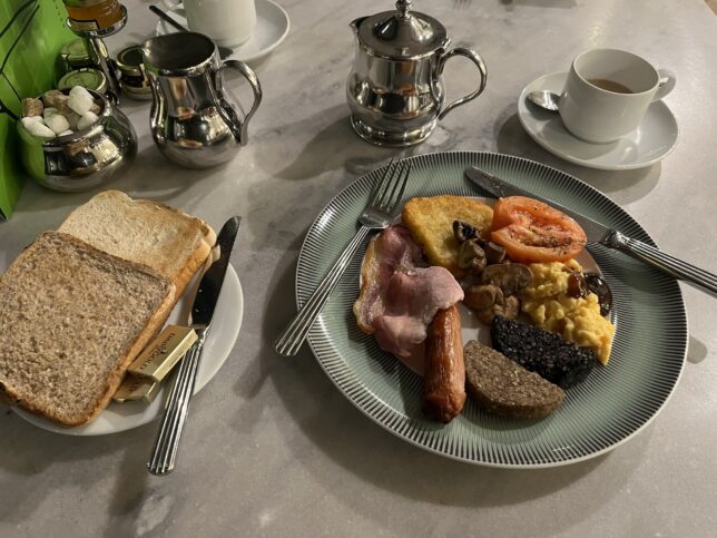 卵料理は好みで目玉焼きやゆで卵に変更可能。バイオーダーたと、半熟か完熟かの希望や、ポーチドエッグ(トーストが座布団になっている卵料理)のリクエストも通じる。ブラックプディングはアイルランドでは欠かせない一品。これが、スコットランドだとハギスに置き換わったり、イングランドではホワイトだけだったりします。かなり濃い味で食べすぎるとやたらと喉が渇きます。このホテルでは半分に割ってくれているので助かります。